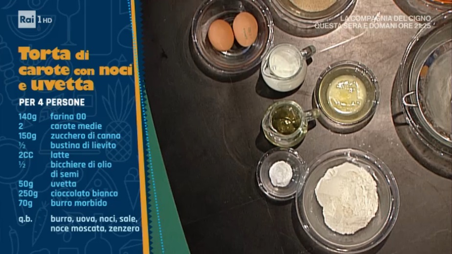 - 140 g farina 00, 2 carote medie, 150 g zucchero di canna, mezza bustina di lievito, 2 cucchiai di latte, mezzo bicchiere di olio di semi, 50 g uvetta, 2 uova, noci, zenzero, noce moscata, 250 g cioccolato bianco, 70 g burro