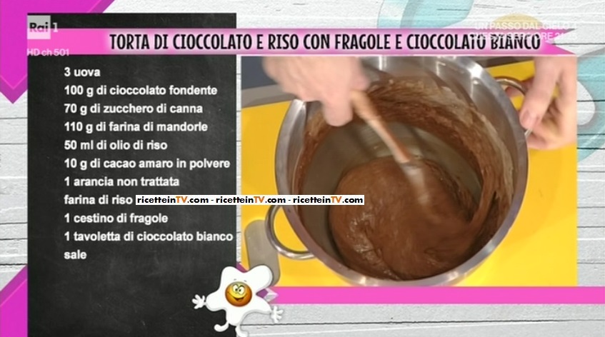 - 3 uova, 100 g cioccolato fondente, 70 g zucchero di canna, 110 g farina di mandorle, 50 ml olio di riso, 10 g cacao amaro in polvere, 1 arancia non trattata, farina di riso, 1 cestino di fragole, 1 tavoletta di cioccolato bianco, sale