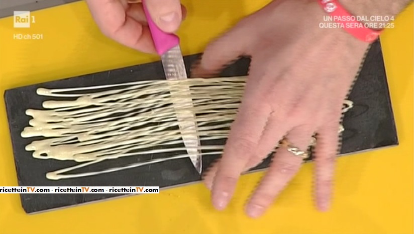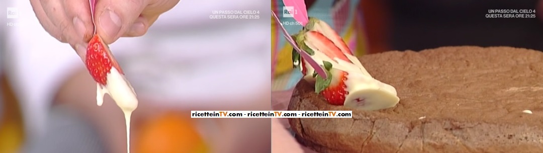 Per decorare, tagliamo a metà le fragole, le infilziamo con gli stuzzicadenti ed immergiamo la punta nel cioccolato bianco fuso. Lasciamo indurire il cioccolato su un foglio di carta forno. Quindi, disponiamo le fragole ai bordi della torta ormai fredda. Inoltre, su un piano freddo, coliamo il cioccolato, in modo da creare dei fili. Prima che si indurisca del tutto, lo solleviamo e diamo la forma desiderata.