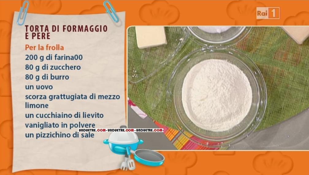 Antonella deve sbucciare e tagliare le pere a pezzetti e metterle in una padella antiaderente con un pochino di burro; la conduttrice le frigge un po’, mettendoci sopra lo zucchero, Alessandra, intanto, prepara la frolla impastando la farina, lo zucchero, la scorza di un limone, il lievito vanigliato, un pizzico di sale e il burro, impasta per bene e per ultimo aggiunge l’uovo, continuando ad impastare fino a ricavarne il panetto di frolla. Stendiamo col mattarello la frolla, mettendola tra due fogli di carta forno; intanto Antonella e Alessandra si dilettano ad elencare proverbi e modi di dire, ridendo di tutto gusto.