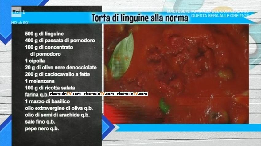 - 500 g linguine, 400 g passata di pomodoro, 100 g concentrato di pomodoro, 1 cipolla, 20 g olive nere denocciolate, 200 g caciocavallo, 1 melanzana, 100 g ricotta salata, farina, basilico, olio evo, olio per friggere, sale, pepe