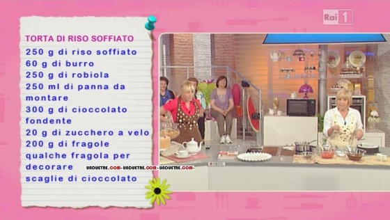Vi proponiamo una gustosa ricetta realizzata in una delle ultime edizioni de La prova del cuoco. ‘Il ballo della casalinga‘ introduce Anna Moroni e le delizie della sua piccola pasticceria casalinga. Anna si prepara a sfornare una torta golosissima: la torta di riso soffiato. Ecco gli ingredienti e il procedimento.