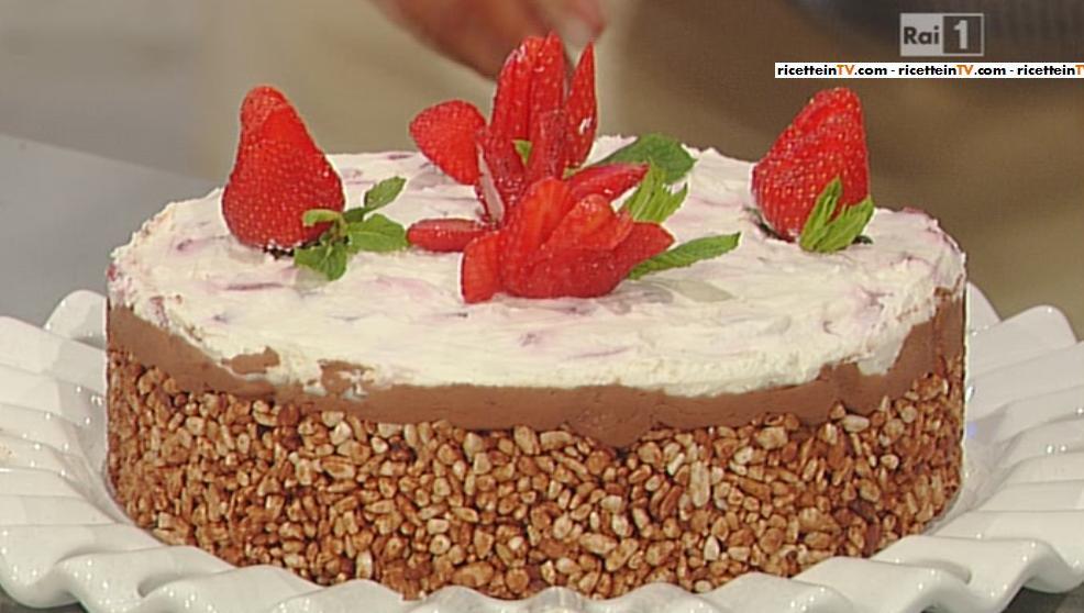 Prima di tutto Antonella deve montare la panna in una ciotola fredda, aggiungendoci anche la robiola e continuanando ad amalgamare con la frusta e continua aggiungendoci anche le fragole a pezzi, spolverate con zucchero a velo, mentre Anna, in una ciotola, al riso soffiato aggiunge il burro sciolto e un più di metà dose del cioccolato fondente (circa 200 gr), che è già stato fuso. Prendiamo una tortiera, foderiamo con carta forno e facciamo la base della torta con il composto di riso soffiato, mettiamo in frigorifero per dieci minuti, ci aggiungiamo poi sopra spalmando bene un composto fatto con panna montata amalgamata alla parte restante di cioccolato fondente fuso (100gr) e, infine, mettiamo sopra il composto di panna montata, robiola e fragole. Poniamo in frigorifero per almeno due ore e poi guarniamo con le fragole. Buon appetito!