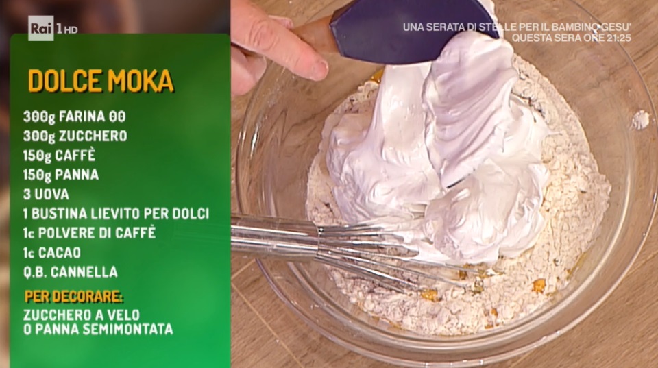 - 3 uova, 300 g zucchero, 300 g farina, 150 g panna, 150 g caffè espresso, 1 bustina di lievito vanigliato per dolci, un pizzico di sale, un pizzico di cannella, 1 cucchiaino polvere di caffè, 1 cucchiaino di cacao amaro