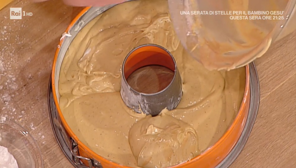 Imburriamo ed infariniamo uno stampo a ciambella. Versiamo all’interno l’impasto e lo livelliamo. Cuociamo in forno preriscaldato e statico a 170° per 40 minuti.