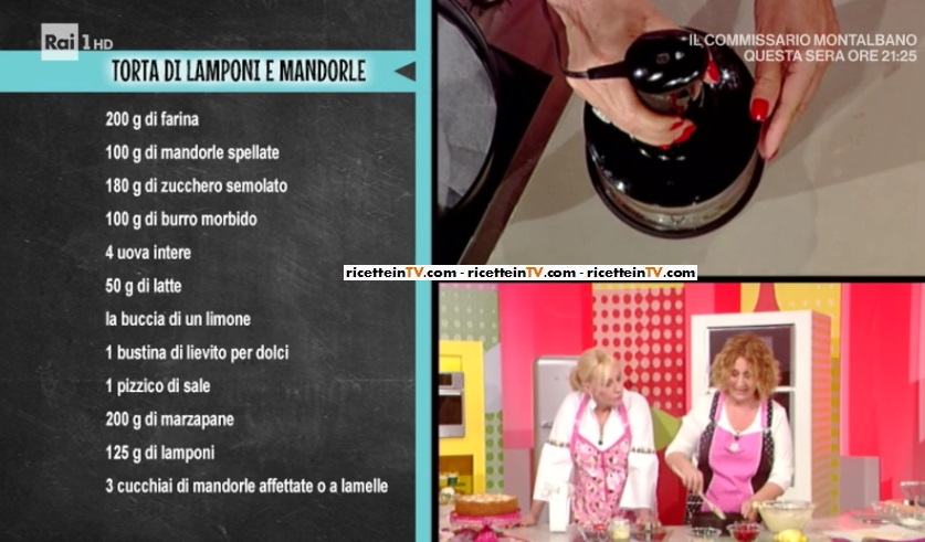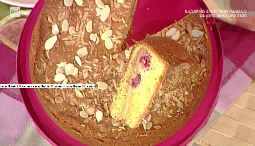 - 200 g farina, 100 g mandorle spellate, 180 g zucchero semolato, 100 g burro morbido, 4 uova intere, 50 g latte, la scorza di un limone, una bustina di lievito per dolci, un pizzico di sale, 200 g marzapane, 125 g lamponi, 3 cucchiai di mandorle a lamelle o affettate