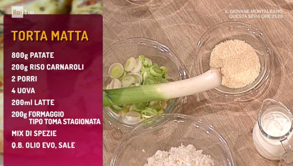 - 800 g patate, 200 g riso carnaroli, 2 porri, 4 uova, 200 ml latte, 200 g formaggio toma stagionata, mix di spezie (coriandolo, cannella, noce moscata, chiodi di garofano, anice stellato ed altre spezie), olio evo