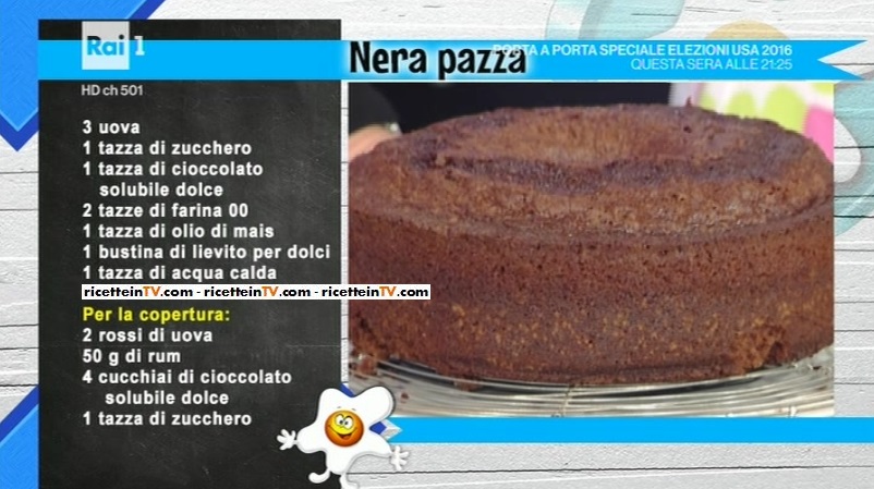 A chiudere il ricco menu di oggi, il dolce dell’infallibile Annina Moroni. Una ciambella golosissima, oltre che un cavallo di battaglia della nostra Anna. La preparazione è estremamente semplice: infatti, potrete misurare gli ingredienti con una tazza. Ecco la ricetta della torta nera pazza.