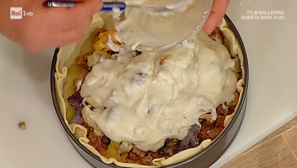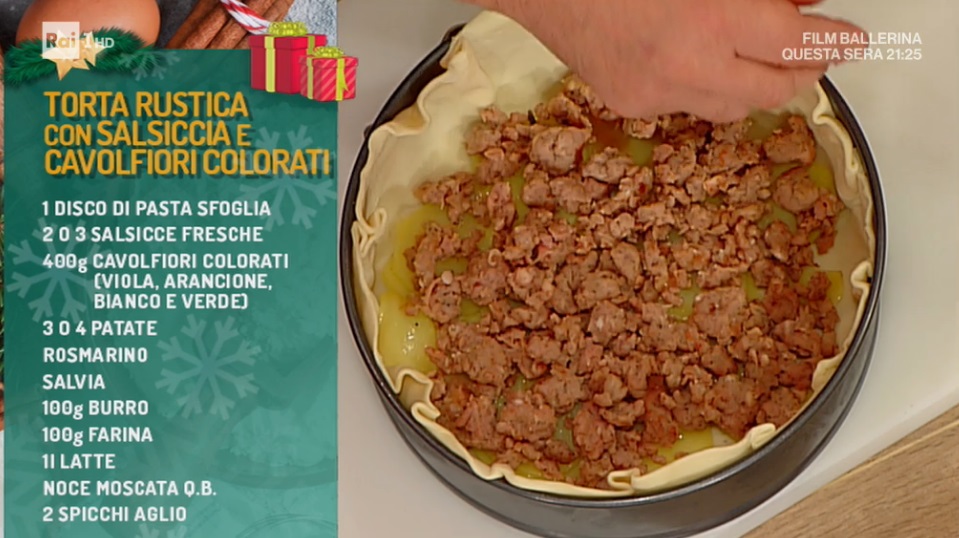 - 1 disco di pasta sfoglia, 2 o 3 salsicce fresche, 400 g cavolfiori colorati, 3 o 4 patate, rosmarino, salvia, 100 g burro, 100 g farina, 1 l latte, noce moscata, 2 spicchi d’aglio