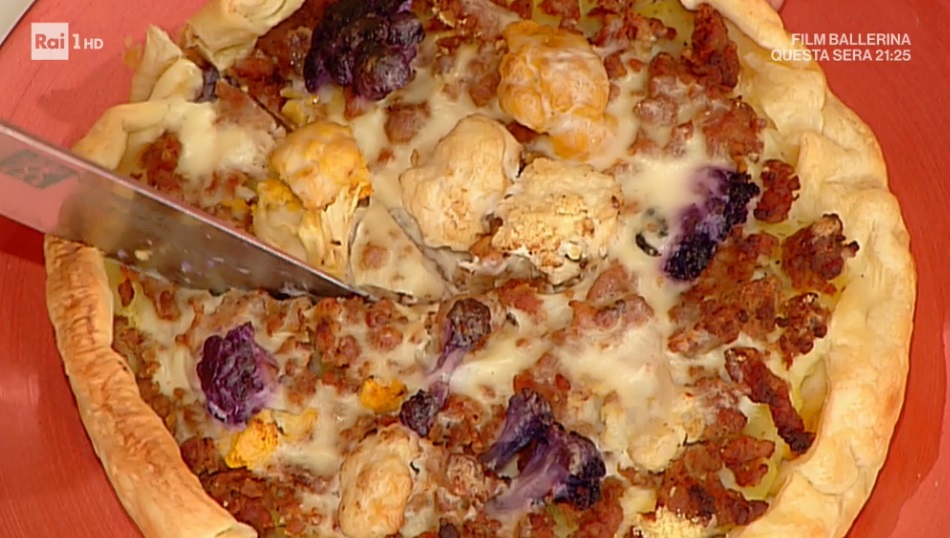 Inseriamo il disco di pasta sfoglia all’interno di una tortiera a cerniera, coprendo il fondo ed i bordi. Bucherelliamo con la forchetta. Distribuiamo sulla base le patate a rondelle. Continuiamo con la salsiccia rosolata e, successivamente, i cavolfiori precedentemente saltati. Copriamo con tutta la besciamella, spolveriamo con abbondante formaggio grattugiato e cuociamo in forno caldo e ventilato a 180° per 50 minuti circa.