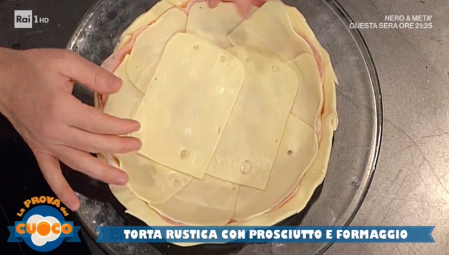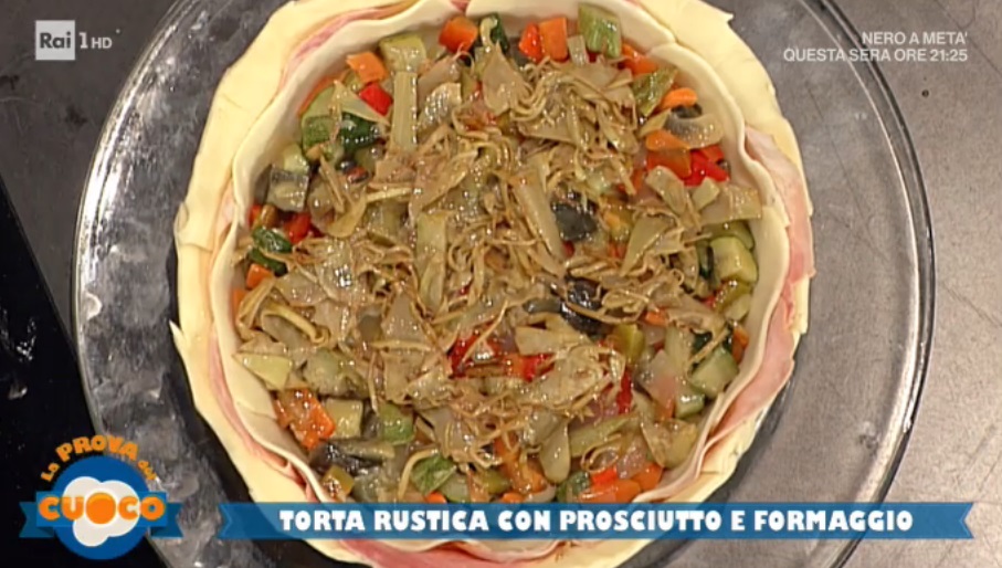 All’interno del guscio di sfoglia, adagiamo le fette di prosciutto (possiamo sostituirlo con altro salume o foglie di lattuga o verza sbollentate ed asciugate), facendole ben aderire sul fondo e sui lati. Sul prosciutto, adagiamo le fette di fontina, sia sul bordo che sul fondo. In questo modo, il salume ed il formaggio isoleranno la sfoglia, che cuocerà meglio in forno. Sul fondo così ‘isolato’ inseriamo le verdure a cubetti spadellate (quelle che abbiamo in frigorifero) ed i carciofi. Copriamo con tutta la crema, che dev’essere ben fredda. Ripieghiamo i bordi della sfoglia sul ripieno. Inforniamo a 200°, forno preriscaldato, fino a doratura (circa 30 minuti).