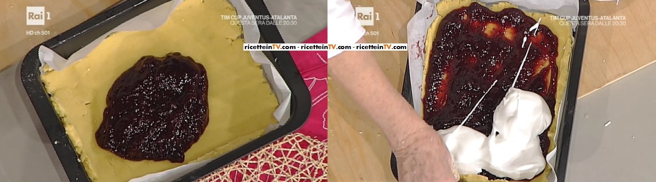 Oppure, dopo aver steso la confettura sopra la frolla cruda, stendiamo sopra anche la meringa ed inforniamo così, una sola volta.