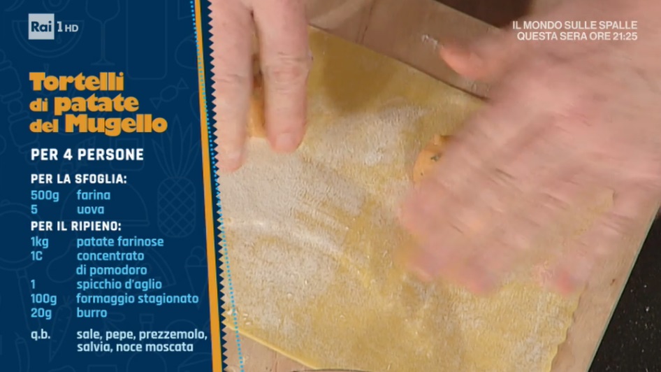 - Ripieno: 1 Kg patate farinose, 1 c concentrato di pomodoro, 1 spicchio d’aglio, 100 g formaggio stagionato, 20 g burro, sale, pepe, prezzemolo, salvia, noce moscata