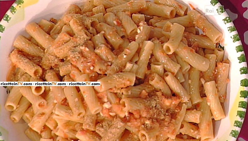 - 320 g di tortiglioni integrali, 6 pomodori maturi, 3 pomodori secchi, 1 spicchio di aglio, 50 g di mandorle sgusciate, 50 g di pangrattato integrale, 10 foglie di basilico, 7 cucchiai di olio evo, sale e pepe
