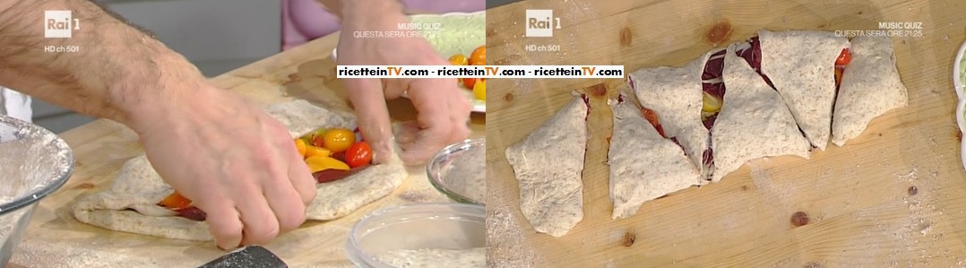Stendiamo l’impasto, dando la forma di un ovale. Disponiamo sopra delle foglie di radicchio intere. Disponiamo sopra le foglie i pomodorini, di vari tipi, tagliati a metà. Aggiungiamo anche i pomodori secchi sottolio tagliati grossolanamente e, se vogliamo, del peperoncino fresco tritato. Richiudiamo i due lembi verso il centro. Sigilliamo i bordi. Otterremo una sorta di calzone. Tagliamo a triangoli. Li disponiamo su una teglia antiaderente o unta d’olio. Li spennelliamo con l’olio ed inforniamo a 200° per 10 minuti circa. Devono essere dorati.