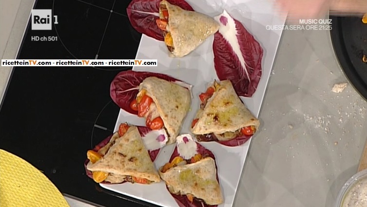 - mezzo litro infuso di limone, 1 g lievito di birra fresco, farina integrale (la dose non è stata specificata), 20 g sale, olio evo, pomodorini, radicchio, pomodori secchi sottolio, peperoncino