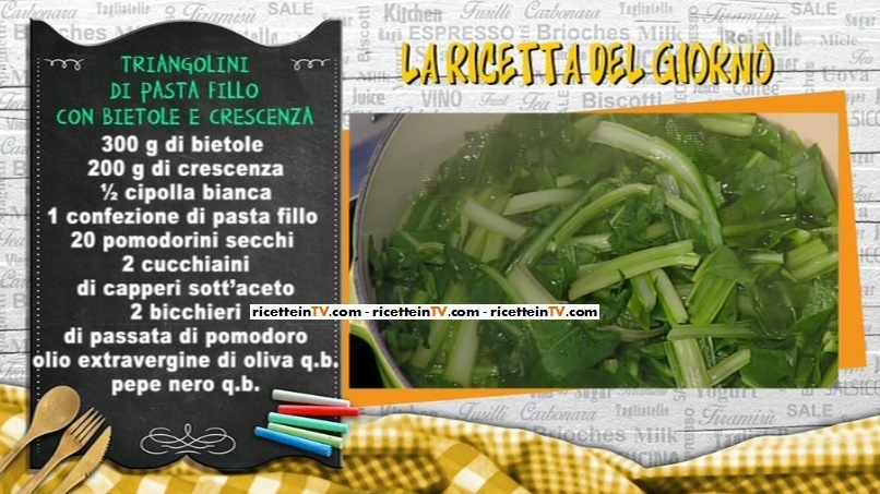 La ricetta del giorno è di Marco Bianchi, il giovane cuoco ricercatore che, anche oggi, non manca di dispensare ottimi consigli, ordinando ad Antonella di mangiare pesce e curcuma per ‘curare’ la congiuntivite. Marco prepara dei triangolini di pasta fillo con bietole e crescenza.