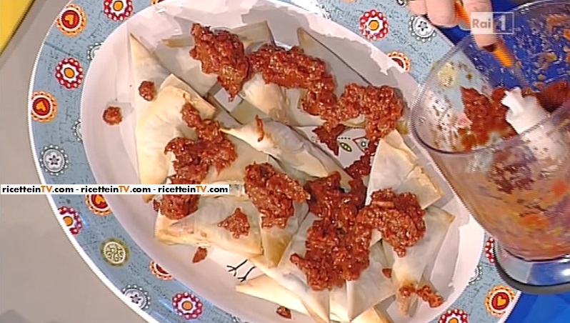 Sbollentiamo la bieta in acqua bollente per pochi minuti. Le scoliamo, lasciandole raffreddare per qualche istante. Le tritiamo grossolanamente, quindi amalgamiamo alla crescenza. In padella, stufiamo la cipolla con un po’ d’acqua. Una volta stufata, la uniamo al composto di bietole e crescenza. Per la salsa, facciamo rinvenire, per qualche ora, il pomodoro secco in acqua. Li strizziamo e li trasferiamo in un mixer, insieme alla passata di pomodoro, i capperi, il pepe ed un filo d’olio. Se volete, arricchite il composto con della curcuma o della paprika. Stendiamo la pasta fillo, prodotta usando dell’olio, anzichè degli altri grassi. Ricaviamo delle strisce; mettiamo su un lato una generosa cucchiaiata di farcia; richiudiamo in modo da ottenere dei triangoli. Disponiamo su una teglia foderata di carta forno e inforniamo 3-5 minuti a 180°. Serviamo con abbondante salsa.