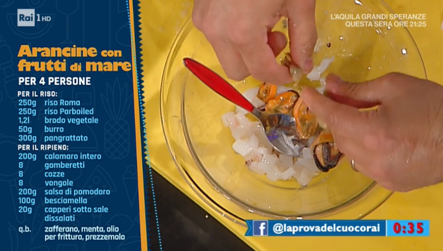 Per l’arancina ai frutti di mare, mescoliamo vongole e cozze sgusciate, gamberetti puliti a pezzetti, calamari puliti e a pezzetti, salsa di pomodoro, besciamella e qualche cappero dissalato e tritato. Mescoliamo e prepariamo delle piccole arancine.
