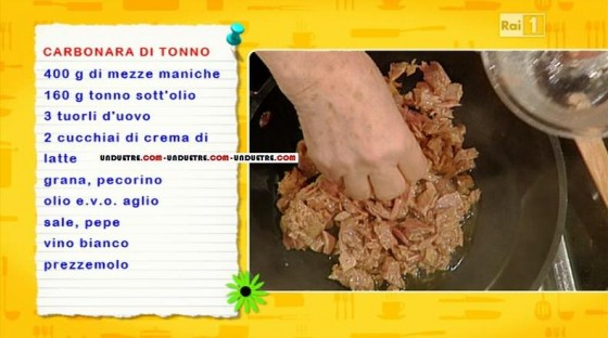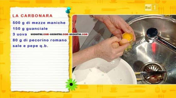 Vi proponiamo una gustosa ricetta realizzata in una delle ultime edizioni de La prova del cuoco. Annina si scatena sulle note de “Il ballo della casalinga“, mentre il pubblico non intende mollare Antonella, tributandole affetto e comprensione. “Oggi faccio tutto io, così tu ti riposi un pochettino“, esordisce Anna, la quale, quest’oggi, propone delle ricette inedite riguardanti la carbonara. “Facciamo tre tipi di sugo della carbonara“, spiega Antonella. La pasta è uguale per le tre versioni, le mezze maniche. Per 300 gr di pasta, Annina usa un uovo ed un rosso. Per la prima versione, Anna aggiunge un po’ di pecorino, mischiato al grana, del pepe ed un po’ di panna fresca.