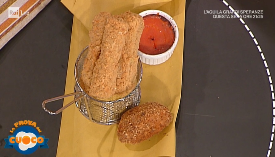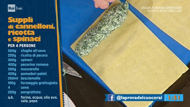Per il supplì di cannelloni, formiamo dapprimo i cannelloni, infarcendo la sfoglia con il ripieno di ricotta e spinaci. Passiamo quindi i cannelloni nella pastella, nel pangrattato e friggiamo fino a doratura. Marco li serve con una salsa al pomodoro e pecorino.