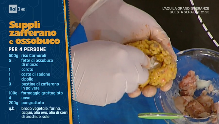 - Supplì zafferano e ossobuco: 500 g riso Carnaroli, 5 fette di ossobuco di manzo, 1 carota, 1 costa di sedano, 1 cipolla, 3 bustine di zafferano in polvere, 100 g formaggio grattugiato, 4 uova, 200 g pangrattato, brodo vegetale, farina, acqua, olio, sale
