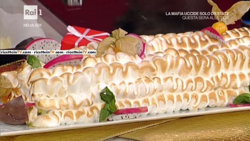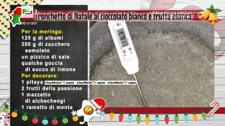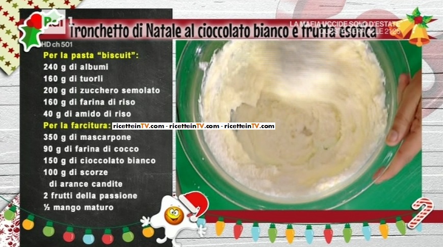 tronchetto di Natale al cioccolatoInfine, il dolce! A prepararlo, quest’oggi, è la simpaticissima Ambra Romani, che pensa già alle feste, proponendo il tronchetto di Natale al cioccolato bianco e frutta esotica.