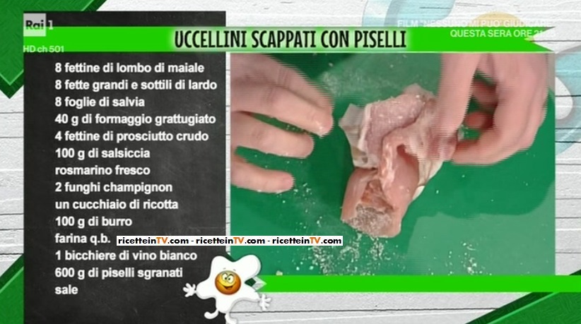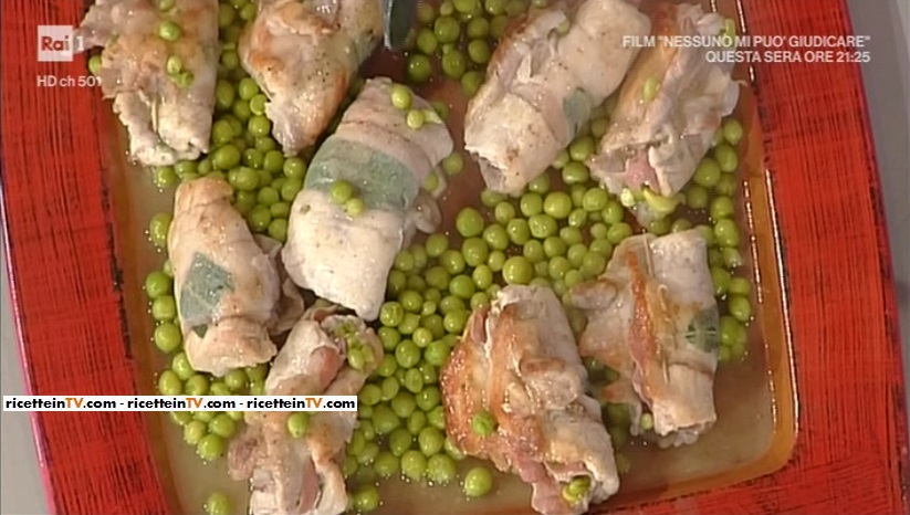 - 8 fettine di lombo di maiale, 8 fette grandi e sottili di lardo, 8 foglie di salvia, 40 g formaggio grattugiato, 4 fettine di prosciutto crudo, 100 g salsiccia, rosmarino, 2 funghi champignon, un cucchiaio di ricotta, 100 g burro, farina, 1 bicchiere di vino bianco, 600 g piselli, sale