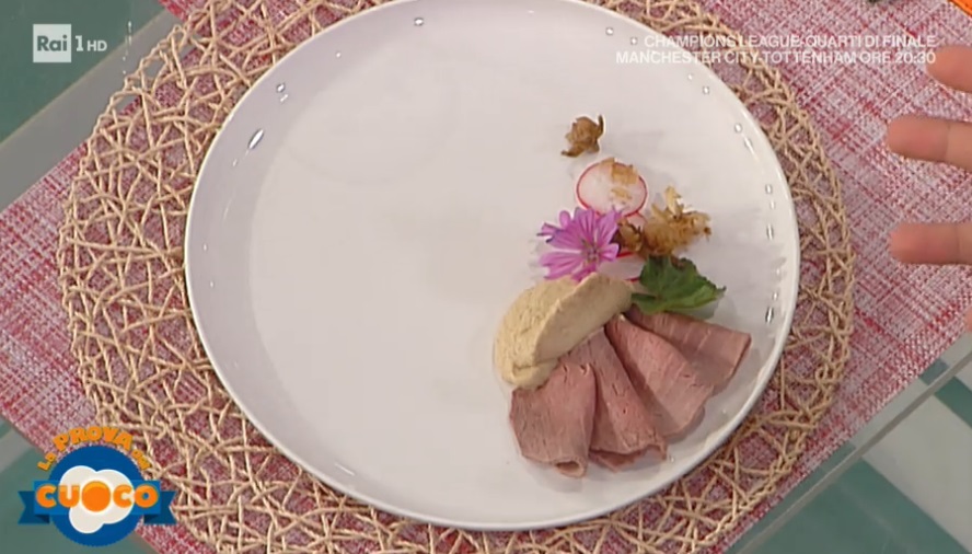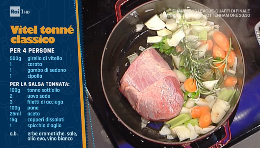 - Salsa: 100 g tonno sott’olio, 2 uova sode, 3 filetti di acciuga, 100 g pane, 25 ml aceto, 15 g capperi dissalati, 1 spicchio d’aglio, erbe aromatiche, sale, olio, vino bianco