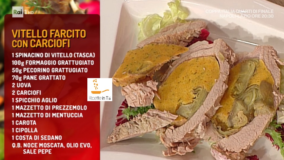 - 1 spinacino di vitello (tasca), 100 g formaggio grattugiato, 50 g pecorino grattugiato, 70 g pane grattato, 2 uova, 2 carciofi, 1 spicchio d’aglio, 1 mazzetto di prezzemolo, 1 mazzetto di mentuccia, 1 carota, 1 cipolla, 1 costa di sedano, noce moscata, olio evo, sale e pepe