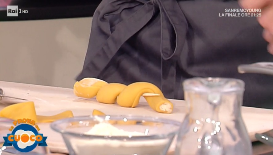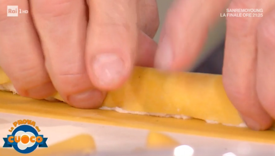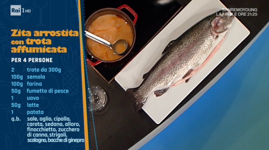 Per la pasta, impastiamo semola e farina con l’uovo ed acqua qb. Lasciamo riposare il panetto, quindi tiriamo una sfoglia sottilissima. Ritagliamo dei rettangoli (10×3 cm). Su ogni rettangolo formiamo un salsicciotto di farcitura di trota. Arrotoliamo la pasta sulla farcitura. Eliminiamo l’estremità. Arrotoliamo lo zito ottenuto intorno ad uno spiedo di legno. Cuociamo in padella con un filo d’olio, quindi sfumiamo con il fumetto di pesce, copriamo e lasciamo cuocere per 3 minuti a fiamma alta.