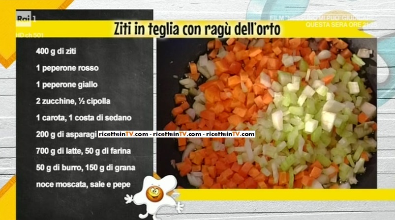 • 400 g ziti, 1 peperone rosso, 1 peperone giallo, 2 zucchine, 1/2 cipolla, 1 carota, 1 costa di sedano, 200 g asparagi, 700 g latte, 50 g farina, 50 g burro, 150 g grana grattugiato, noce moscata, sale e pepe