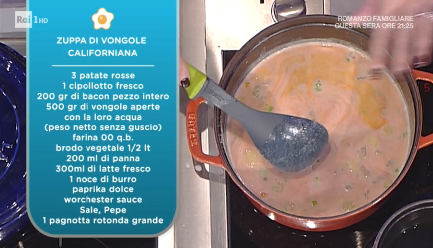 - 3 patate rosse, 1 cipollotto fresco, 200 g bacon pezzo intero, 500 g vongole aperte (peso netto senza guscio), mezzo l brodo vegetale, 200 ml panna, 300 ml latte, 1 noce di burro, paprika dolce, worcester sauce, sale e pepe, 1 pagnotta rotonda