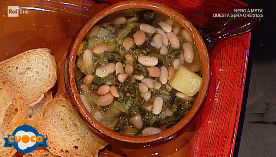 - 350 g fagioli cannellini già cotti, 350 g fagioli borlotti già cotti, 500 ml brodo di cottura dei fagioli o vegetale, 2 patate medie, 2 cipolle, 3 carote, 2 coste sedano, 1 porri, 1 mazzo cavolo nero, 1 mazzo bietole, sale, pepe, fiori di finocchietto, pane toscano, olio