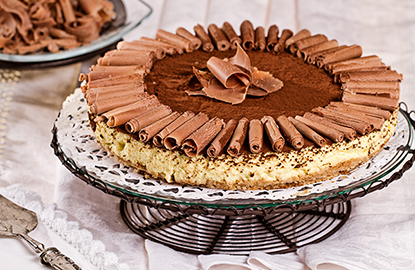 Una volta che la cheesecake si è rassodata, sformatela e spolverizzate con il cacao amaro. Ora disponete i riccioli di cioccolato sulla superficie della cheesecake tiramisù.