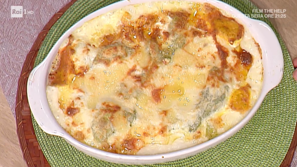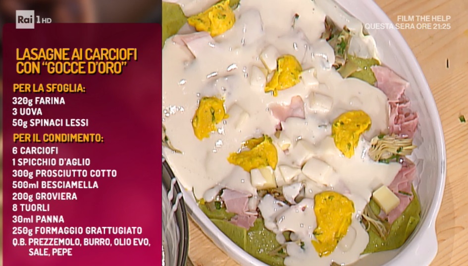 All’interno di una pirofila imburrata, alterniamo strati di besciamella, lasagne scottate, prosciutto cotto affettato, carciofi trifolati, groviera a cubetti e formaggio grattugiato, besciamella e ‘gocce d’oro’ (con un cucchiaino, facciamo colare il composto di tuorli). Proseguiamo in questo modo fino ad esaurire gli ingredienti. Cuociamo in forno preriscaldato a 180° per 50 minuti.