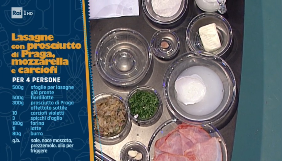 - 500 g sfoglie per lasagne già pronte, 500 g mozzarella fiordilatte, 300 g prosciutto di Praga affettato, 10 carciofi violetti, 3 spicchi d’aglio, 180 g farina, 1 l latte, 80 g burro, sale, noce moscata, prezzemolo, olio