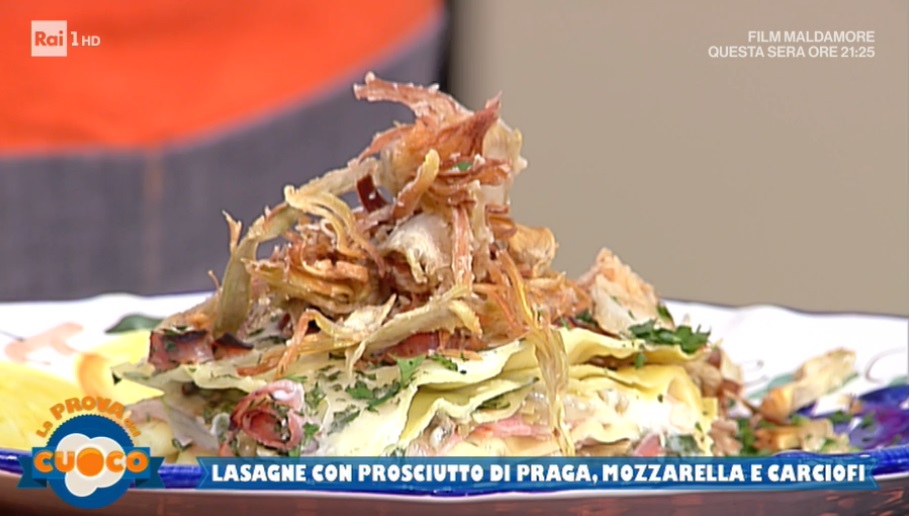 Alla base di una pirofila, spalmiamo un po’ di besciamella. Disponiamo sopra la pasta all’uovo. Copriamo con uno strato di besciamella e disponiamo sopra la mozzarella a fette spesse. Continuiamo con il prosciutto cotto di Praga affettato (affumicato), i carciofi spadellati e del prezzemolo tritato. Ripetiamo lo strato. Finiamo con pasta all’uovo, besciamella e riccioli di prosciutto cotto di Praga. Spolveriamo con il prezzemolo ed inforniamo a 180° fino a doratura, circa 35 minuti. Serviamo con delle lamelle di carciofi infarinati e fritti.
