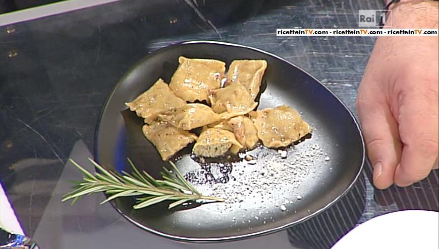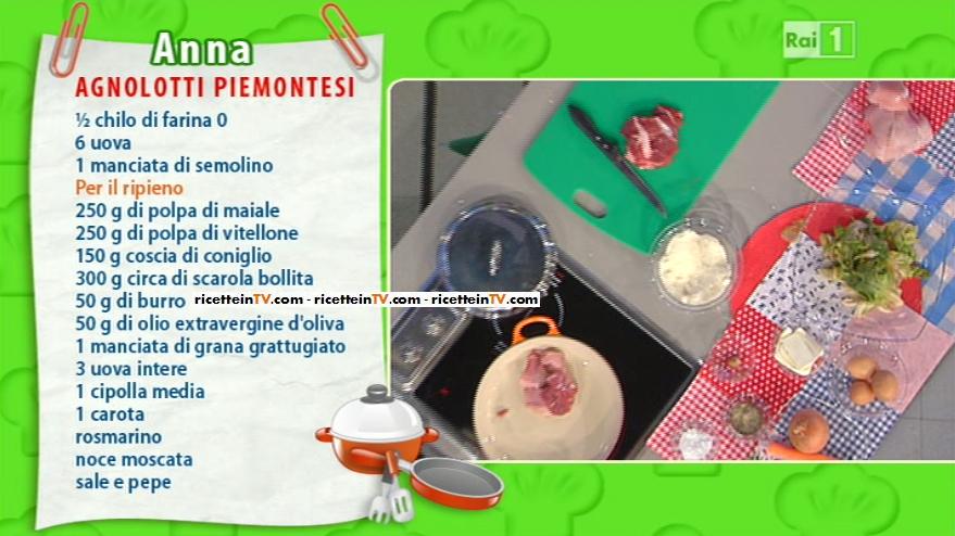 Anna, invece, fa cuocere in padella la carne mista (vitello, maiale, coniglio) per due ore, con tutti gli odori (salvia, rosmarino, ecc.).Una volta cotta, trita la carne, aggiunge la scarola tritata, parmigiano e uova, quindi amalgama tutto. Per la sfoglia dei ravioli, impasta gli ingredienti indicati nella schermata. Stende la sfoglia, la riempie col composto e chiude con dei pizzichi, formando gli agnolotti che cuoce nell’acqua. Li condisce con il fondo di cottura della carne.