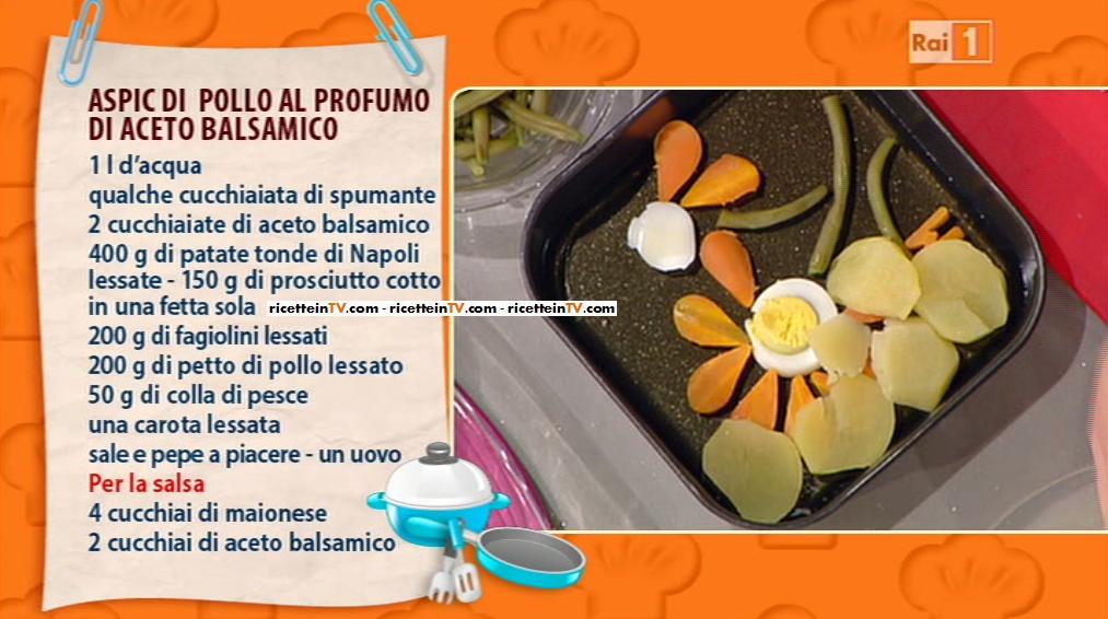 Per prima cosa mettiamo la gelatina nell’acqua fredda, in un recipiente trasparente e piatto. In un pentolino, aromatizziamo dell’acqua con spumante e aceto balsamico, poi mettiamo a sciogliere la gelatina, che abbiamo tolto dall’acqua e strizzato. Lessiamo a parte patate, fagiolini e carote e facciamo raffreddare tutto. In uno stampo, tortiera rotonda o quadrata, mettiamo sul fondo uno strato di composto di acqua aromatizzata, lasciamo raffreddare e mettiamo in frigorifero per circa 20 minuti. Con le verdure (tranne le patate) e un uovo sodo tagliato a fettine formiamo uno strato, creando decorazioni a piacere, ricopriamo tutto di fette di patate lessate, aggiungiamo il pollo lessato e tagliato a pezzetti, prosciutto tagliato a pezzetti, altre verdure e ricopriamo il tutto con la restante gelatina. Mettiamo in frigorifero per almeno un paio di ore. Impiattiamo guarnendo con altra gelatina e maionese aromatizzata con aceto balsamico e diluita con un goccio di acqua.