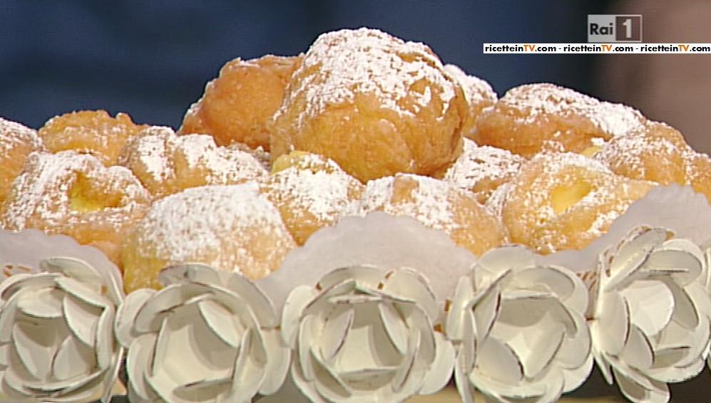 Scaldiamo 250 gr di acqua, aggiungiamo 50 gr di burro e, quando quest’ultimo si è sciolto, uniamo 150 gr di farina 00; lasciamo cuocere finchè sfrigola e l’impasto si stacca dal pentolino. Una volta cotto, trasferiamo il composto nel mixer e uniamo quattro uova (mettendone una per volta). Ricaviamo i bignè stampandoli su carta forno, quindi li friggiamo nell’olio caldo di arachidi. Li farciamo con la crema pasticcera, fatta con 750 gr di latte intero, 250 gr di panna fresca, 300 gr di zucchero, 25 gr di amido di riso, 30 gr di frumina, 9 tuorli d’uovo e una stecca di vaniglia. Scaldiamo il latte con la panna, uniamo gli amidi, la vaniglia, lo zucchero e le uova. Farciamo i bignè, spolveriamo di zucchero e buon appetito!