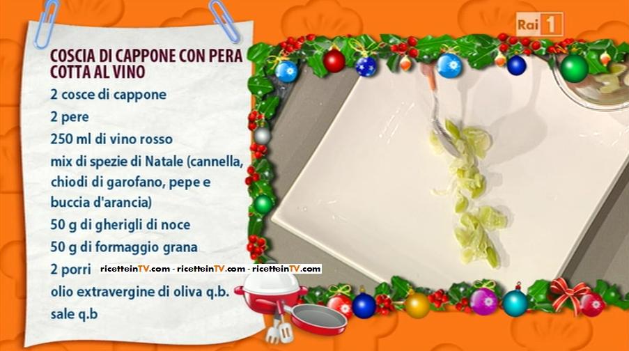 Scopriamo i segreti dello chef Andrea Ribaldone, nella puntata odierna de La prova del cuoco. Nel menu di oggi un piatto natalizio, oltre che golosissimo, la coscia di cappone con pera cotta al vino rosso. Di seguito ingredienti e preparazione.