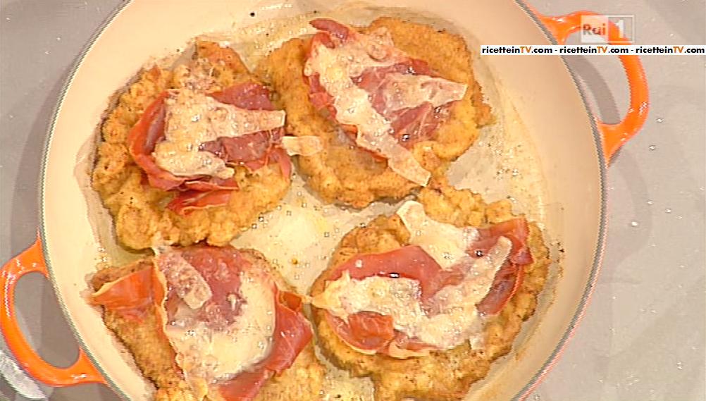 Puliamo e pareggiamo le fettine di fesa di vitello, le mettiamo a bagno nell’uovo sbattuto per circa un’ora, poi le passiamo nella farina, nel pangrattato, a cui abbiamo unito del parmigiano, e le passiamo ancora nell’uovo, quindi nel pangrattato e grana e, infine, le friggiamo in olio e burro. Una volta fritte, mettiamo sopra delle fettine di prosciutto crudo, delle scagliette di grana, rimettiamo in una pentola insieme a qualche cucchiaio di brodo vegetale e inforniamo a 200° per 10 minuti.