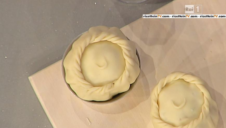 Per l’impasto della sfoglia, Anna usa la farina 0, la semola, lo strutto, l’acqua salata. Per il ripieno mette in padella il lombo di maiale a pezzetti con un goccio di olio, fa rosolare, aggiunge le patate tagliate a cubetti, poi aggiunge i pomodori secchi, il concentrato di pomodoro, i chiodi di garofano, quindi lascia cuocere qualche minuto. Una volta raffreddata la carne, unisce il lardo, le olive verdi, un trito di prezzemolo e aglio e amalgama il tutto. Tira la sfoglia, lasciandola spessa, ricava dei dischi, li riempie con il composto fatto, chiude formando dei fagottini, infine inforna a 190° per circa 20 minuti.