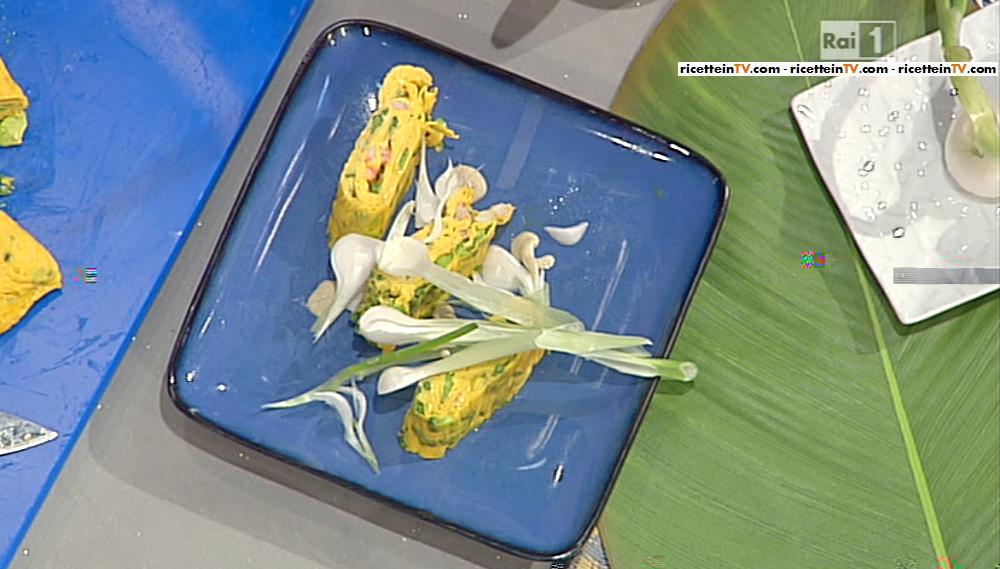 Rompiamo 9 uova intere, le sbattiamo e le passiamo a setaccio (uno scolapasta). Aggiungiamo alle uova un mestolo di vino bianco, le alici ed i gamberi tagliati a pezzetti, il cipollotto tritato, le favette, il basilico e l’asparagina; senza dimenticare un pizzico di sale. Cuociamo la frittata in padella (Pascucci la arrotola e, poi, la affetta), quindi la serviamo con del cipollotto affettato fine e salsa di alici (alici, aglio ed un po’ d’aceto).