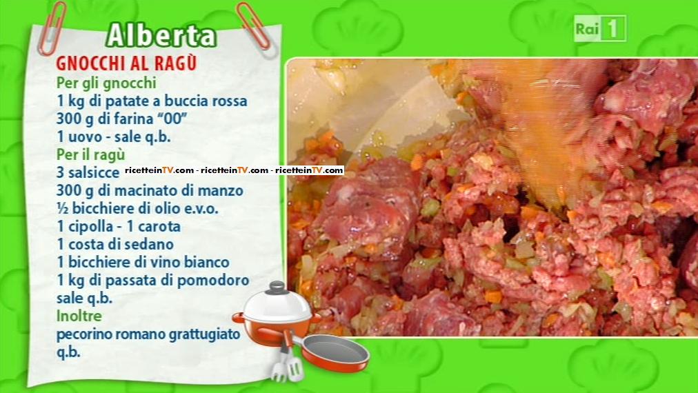 Alberta prepara il ragù partendo da un soffritto di sedano, carota e cipolla ed un po’ di olio; proseguiamo aggiungendo il macinato di carne, le salsicce tagliate a pezzi e facciamo rosolare; sfumiamo con il vino, uniamo il concentrato di pomodoro e facciamo cuocere per circa due ore. Per gli gnocchi, facciamo bollire le patate, le schiacciamo; una volta raffreddate, uniamo la farina, un uovo,  impastiamo e formiamo gli gnocchi.