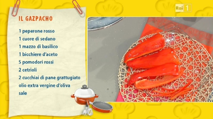 Iniziamo frullando i peperoni, che abbiamo precedentemente privato della pelle e fatto spurgare in acqua e sale. Mettiamo nel mixer anche il cuore di sedano, i pomodori, il basilico, i cetrioli, la cipolla, quindi sale, pepe ed aceto. Frulliamo, se occorre, aggiungiamo del pangrattato o, se troppo denso, un po’ d’acqua.
