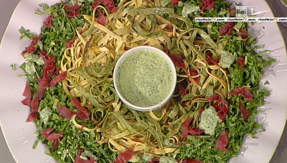 Prepariamo l’impasto per le crepes, amalgamando uova, farina e latte, aggiungiamo un goccio di olio, un pizzico di sale e dividiamo l’impasto in due parti. Ad uno uniamo il prezzemolo, maggiorana ed erba cipollina. Lasciamo riposare per mezz’ora, quindi cuociamo poi i composti a mestolate in una padella antiaderente, in modo da ottenere le crepes. Una volta cotte, le tagliamo a strisicoline come fossero delle tagliatelle. Prepariamo una salsa, frullando il basilico con lo yogurt, poi uniamo la maionese e, se la salsa risulta troppo densa, mettiamo un goccio di acqua. Puliamo la rucola, la condiamo, la tagliuzziamo e la usiamo per guarnire il piatto di portata. Impiattiamo servendo le tagliatelle di crespelline con la bresaola tagliata a pezzetti, con la salsa al basilico, il limone e la rucola.