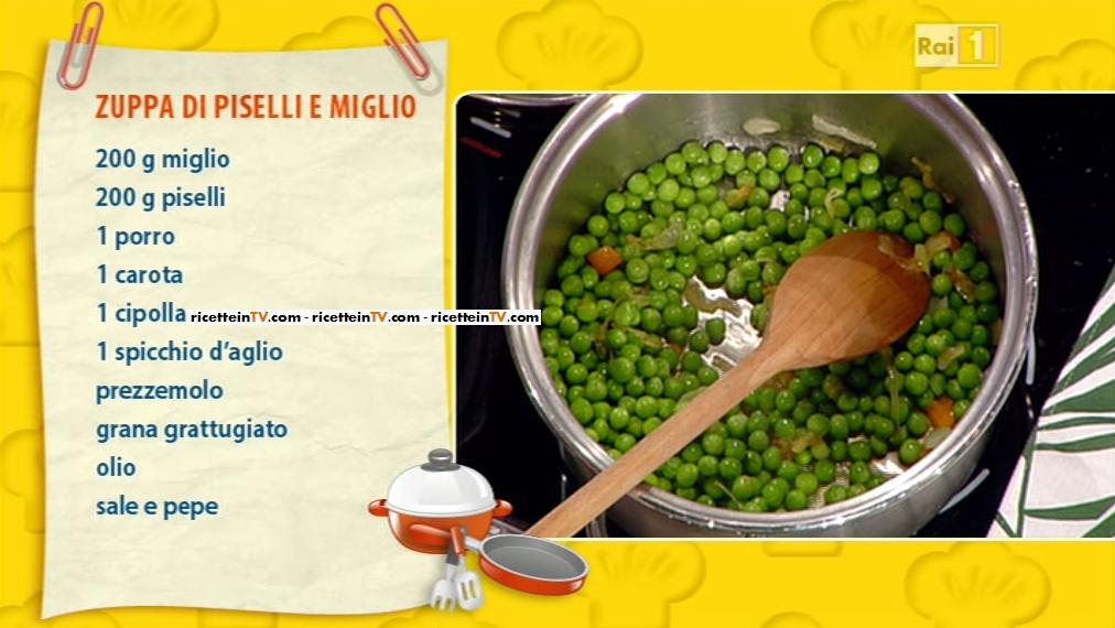 Soffriggiamo con un po’ d’olio d’oliva della cipolla, carote e porro; aggiungiamo i piselli, quindi il miglio, che abbiamo lavato accuratamente, allunghiamo con dell’acqua calda, saliamo, pepiamo e lasciamo cuocere per 20-25 minuti. Prima si servire, arricchiamo con un filo d’olio e del parmigiano grattugiato.