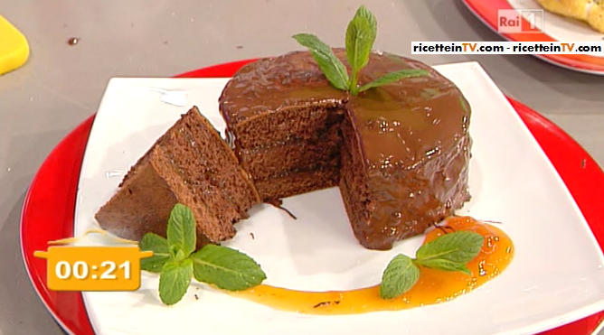 Facciamo ammorbidire della confettura di albicocca in un pentolino, prendiamo del pan di spagna al cioccolato a forma circolare e lo tagliamo in tre dischi uguali, li farciamo con la confettura di albicocche, chiudiamo formando tre strati, ricopriamo di cioccolato fatto fondendo a bagnomaria degli ovetti di cioccolato con un goccio di olio extravergine, guarniamo con confettura di albicocche e foglioline di menta.